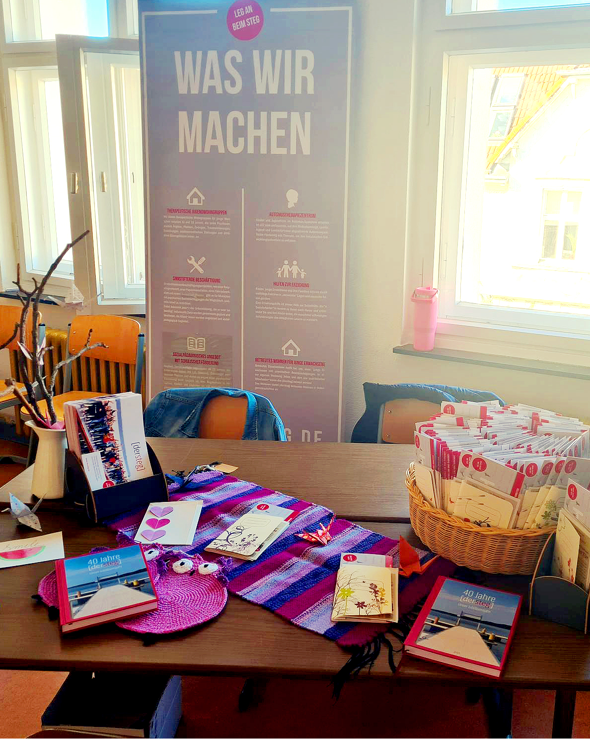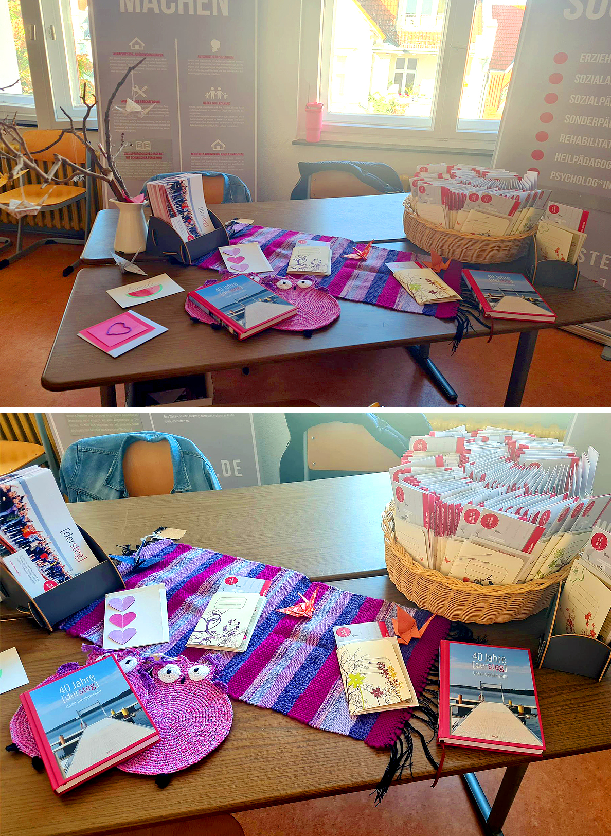 Bei der Praxisstellenbörse für angehende Erzieher*innen und Sozialassistent*innen an der Anna-Freud-Schule haben wir uns mit einem bunten Stand präsentiert. Neben reichlich inhaltlichem Input und Informationen rund um unser Unternehmen, konnten die Besucher*innen selbsthergestellte Arbeiten aus der Papierstrasse und dem „fadengut“ – beides Projekte der Flexiblen Tagesstätte beim Steg – bestaunen.