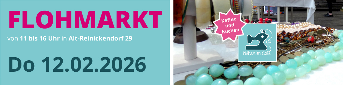Wann 12.02., 12.03. (Ostermarkt 14 bis 17 Uhr), 09.04., 07.05., 11.06., 16.07., 20.08., 10.09. jeweils von 11 bis 16 Uhr bzw. von 14 bis 17 Uhr (Ostermarkt) / Wo Im „Nähen im Café“, Alt-Reinickendorf 29 / Was Flohmarkt vom „Nähen im Café“, angeboten werden Kleidung, Accessoires, Dekoartikel, Schmuck, Spielzeug etc., außerdem gibt es Kaffee und Kuchen
